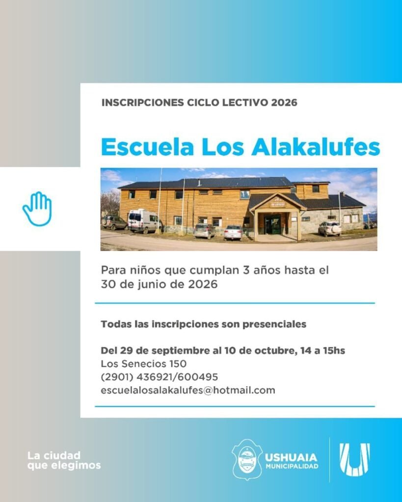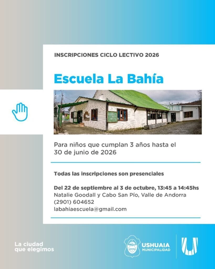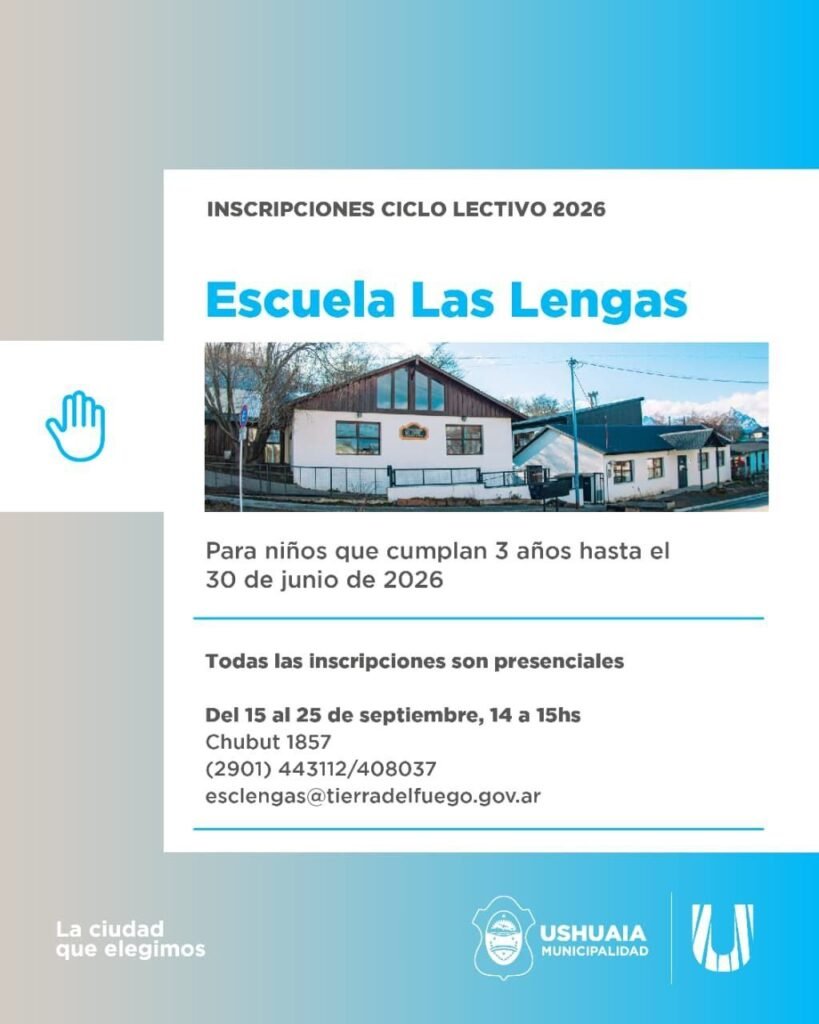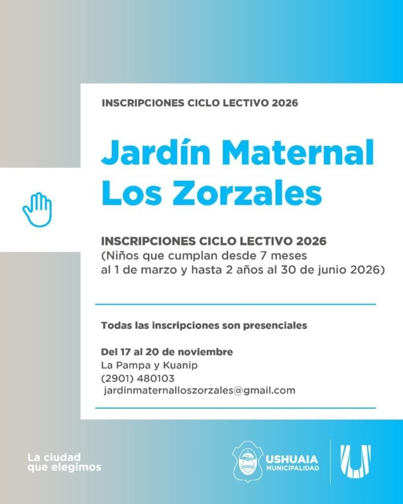 Para el Jardín Maternal “Los Zorzales”, apuntado a niños y niñas desde 7 meses al 1 de marzo y hasta 2 años al 30 de junio, será del 17 al 20 de noviembre de 13:00 a 14:00 horas en La Pampa y Kuanip o al teléfono (2901) 480103. Finalizando, para el Instituto de Educación Superior “Terra Nova”, las inscripciones contarán con dos instancias siendo la primera del 9 al 12 de diciembre de 2025 y del 18 al 27 de febrero de 2026. La misma podrá realizarse a los mails instituto.terranova@ushuaia.gob.ar o institutoterranovaushuaia@gmail.com o de forma presencial en la Escuela “Las Lengas” en Chubut N° 1857 de 10:00 a 12:00 horas, contando también con la vía telefónica (2901) 586768 – 487403 – 468793.